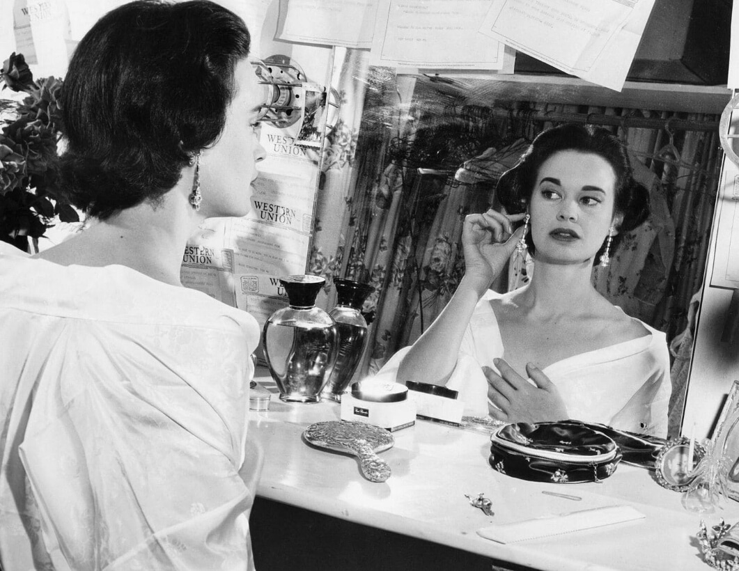 A big bottle of Rochas Femme and an Erno Laszlo jar (possibly containing face powder) sit on the heiress’ table at the Pocono Playhouse in Mountainhome, Pennsylvania, where she performed in the play The Swan by Ferenc Moldar. This happened in 1954.