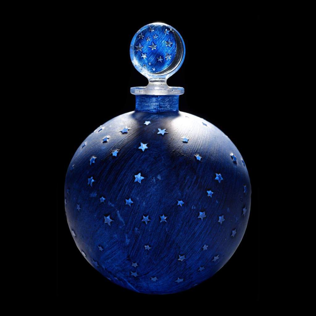 The first thing one notices on her vanity is the massive bottle of Worth Dans la Nuit: made of frosted blue-stained glass and decorated by raised stars, it was made by Lalique in 1924. This is an early issue of the bottle, as we can see from the stopper, described as “a disc with an eclipsed moon of crystal-polished glass in bas-relief against a cobalt-stained sky filled with raised, crystal-polished stars”. This stopper stopped being produced in the 1930s because of an allegation of trademark infringment, so the later versions feature the eclipsed moon only.