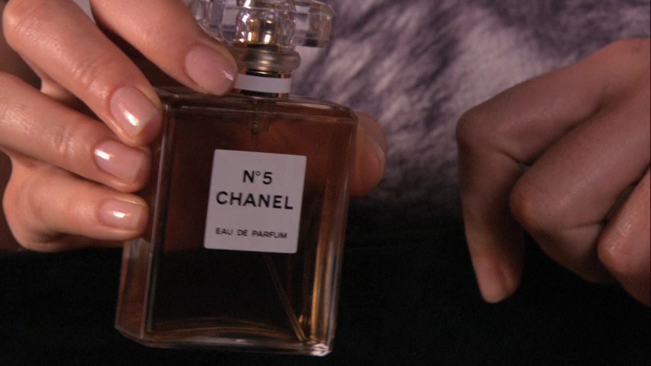 Blair (Leighton Meester) steals a bottle of Chanel no. 5 perfume from a desk at W offices..