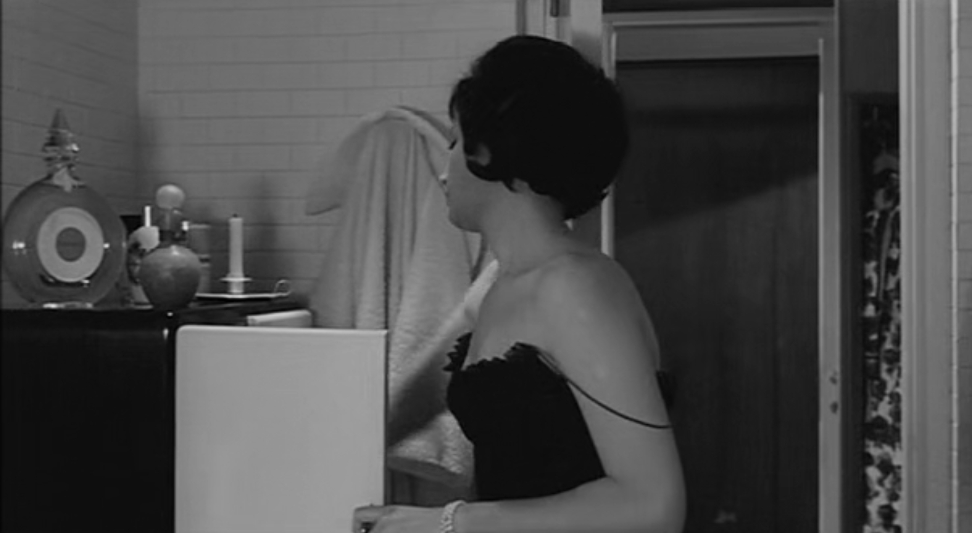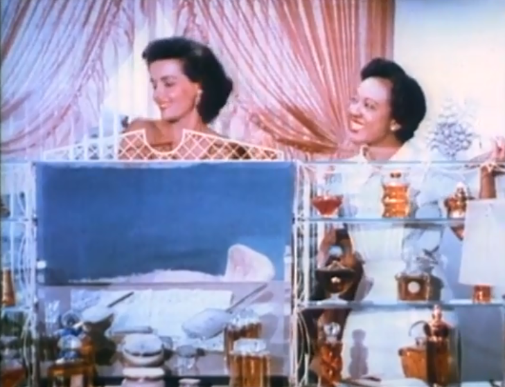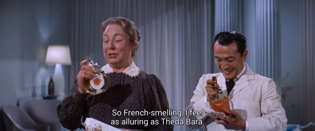 The first bottle which appears in this scene is in the bathroom, where Mame’s maid, Clare (Theresa Harris) is spraying some fragrance.