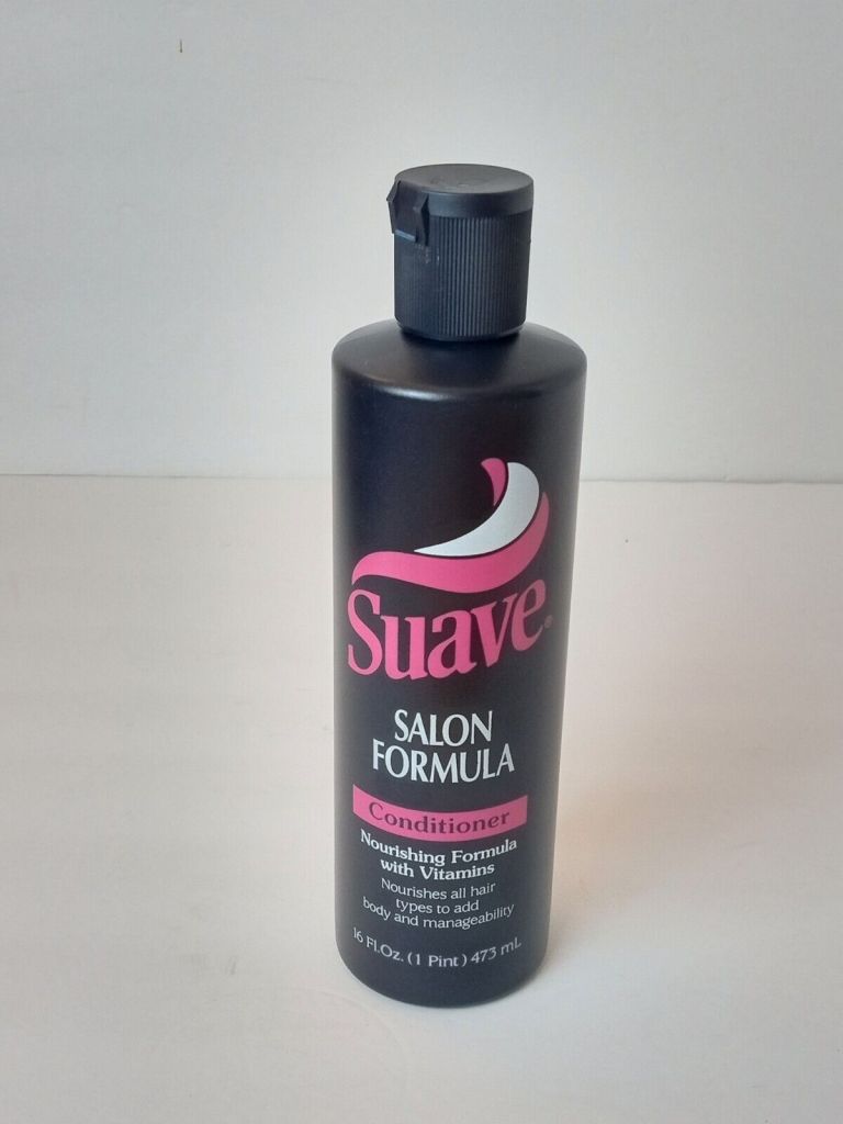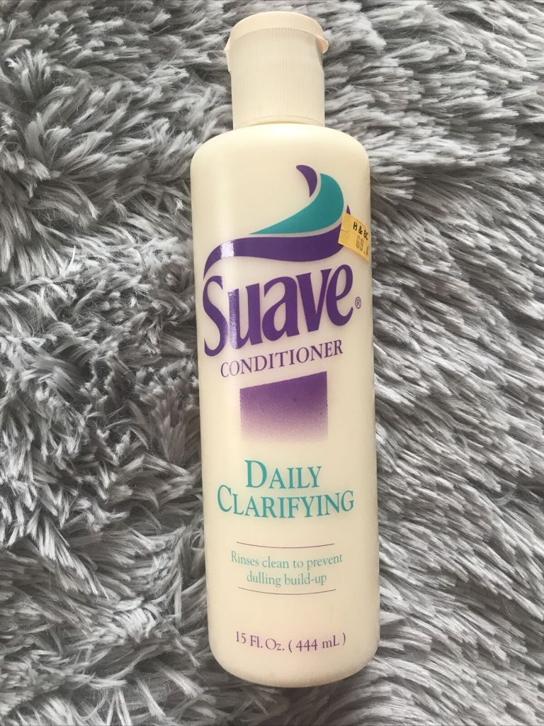 Other Suave products follow: the white bottle with purple and sage green logo is Suave Daily Clarifying conditioner. The metallic blue bottle contains Suave Frequent Use conditioner.