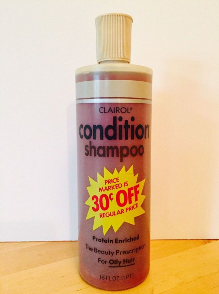 The pink plastic bottle on the left is Clairol condition shampoo.