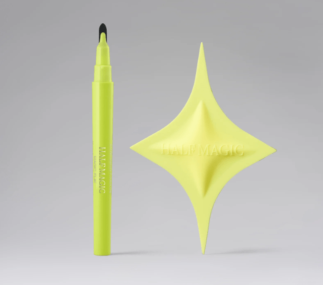 The yellow kite-shaped object on the left is from the Flik-Off set by Half Magic: it’s Wing Magician, a reusable silicone guide to draw eyeliner flicks.