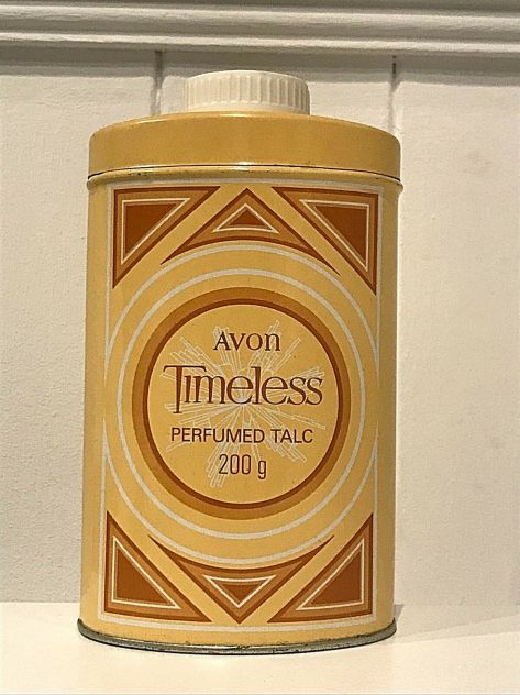 There’s a tin bottle of Avon Timeless perfumed talc in Alex’s bathroom. The graphics on the packaging are the ones seen on the cardboard talc shaker above.