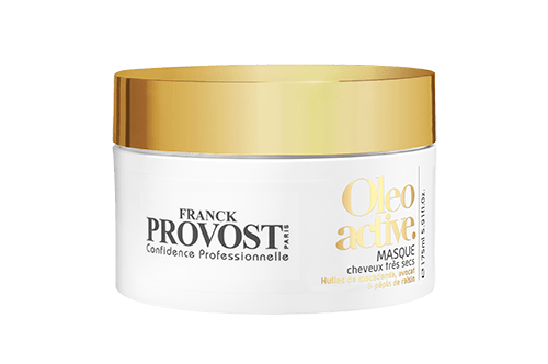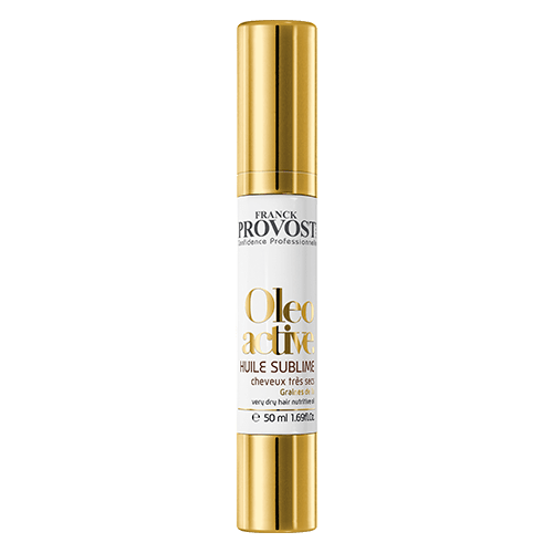 The white tall bottle and jar with gold caps are from the Oleo Active line: they are Huile Sublime, a treatment for very dry hair, and the mask.