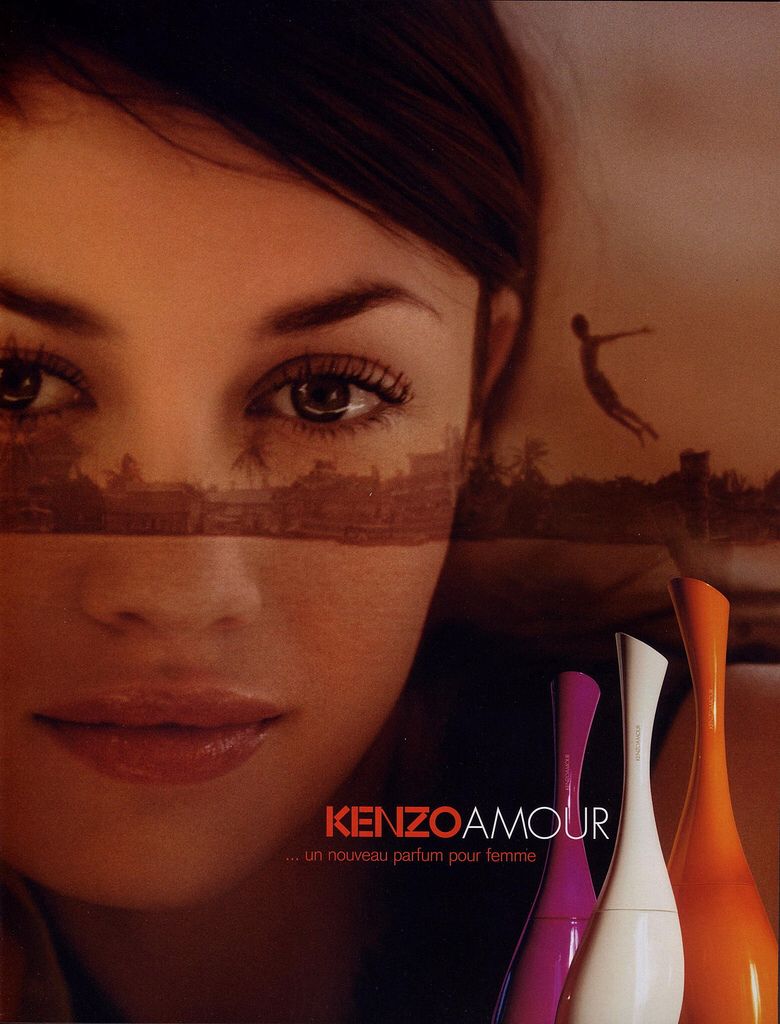 The tall white bottle behind her tea cup is Kenzo Amour eau de parfum, an amber vanilla fragrance created by Daphné Bugey and Olivier Cresp and launched in 2006.