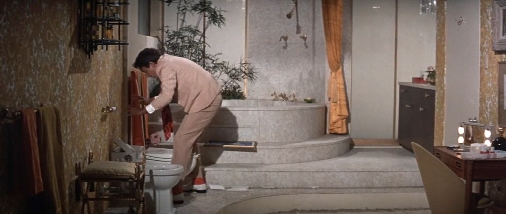 This is the second bathroom he visits in the lavish mansion: there’s a small dressing table in it, so it’s probably used mostly by Alice, the general’s wife. On one shelf hanging on the wall we can see a houndstooth bottle by Christian Dior. The front label is impossible to read, so we can make some guesses: it could be Miss Dior (created by Paul Vacher and Jean Carles in 1947), Diorissimo (created by Edmond Roudnitska and launched in 1956), Diorama (another Roudnitska creation from 1948) or even Diorling (a chypre creation by Paul Vacher launched in 1963).