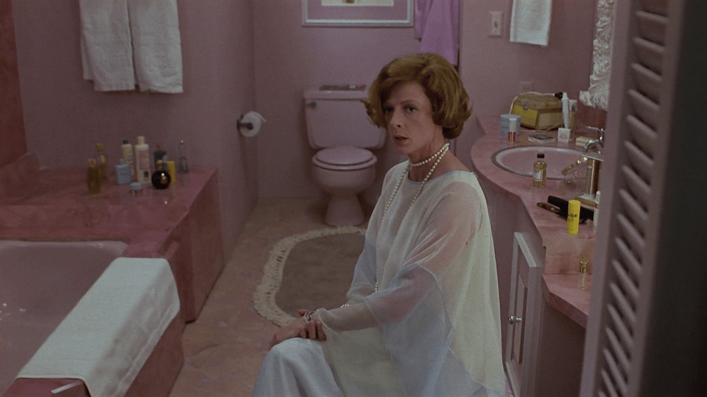 Diana Barrie (Maggie Smith) is a British actress who is in Los Angeles after getting her first Oscar nomination. While she’s sitting in her in-suite bathroom at the Beverly Hills Hotel, we can see several toiletries on the pink marble counters around her.
