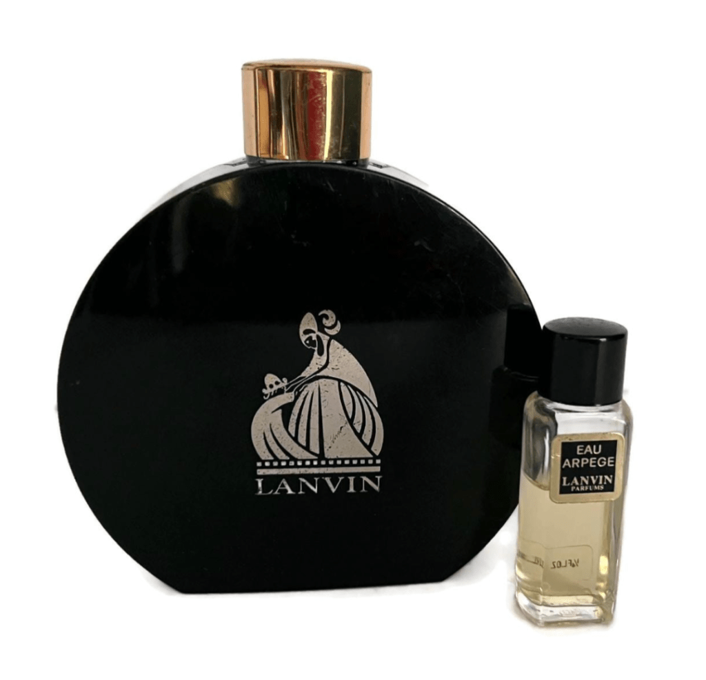 If you are a fan of this music video, I bet you’ve never realised that the round bottle sitting on a shelf (left side of the screen) is a real product. It’s a beautiful glossy black Lanvin talcum powder duster. Possibly the fragrance of this perfumed talc was Arpège, the white floral creation by Paul Vacher and Andre Fraysse launched in 1927.