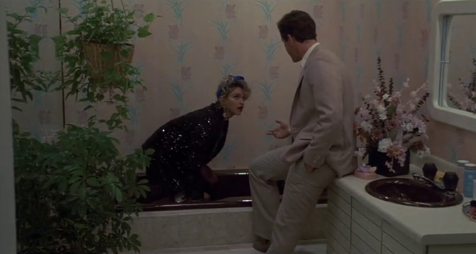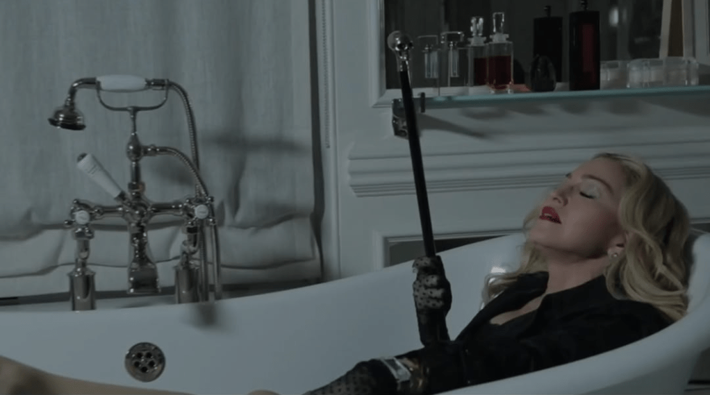 Madonna recently posted this picture on her Instagram account. Sitting on a bench and posing with a Balenciaga Hourglass bag (covered in scotch tape!), she gave us the opportunity to take a look around her luxurious marble bathroom.