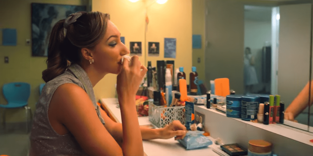Jodi (Ava Michelle) is sitting at a dressing table after performing as Kim McAfee in the musical Bye Bye Birdie.