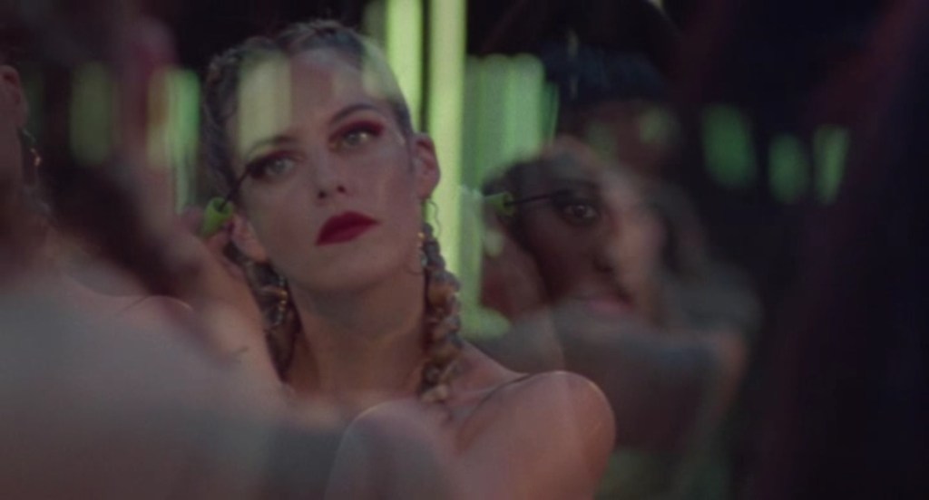 One of the most visually striking scenes of the film sees the two protagonists – Zola (Taylour Paige) and Stefani (Riley Keough) – getting ready to dance. The uncomfortable and pervasive way with which Stefani enters Zola’s life is all here – the images of the girls reflected on mirrors overlap, a symbol of how one (Stefani) presents herself as a double of the other (Zola). This will become clearer as the film unfolds: Stefani systematically appropriates black culture (the language, the aesthetics, even the grooming tools) for her own (professional) advantage.