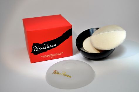 The black and white jar on Lori’s dressing table is the perfumed pressed body powder by Paloma Picasso. Now discontinued, this product was part of the line launched with the perfume in 1984.