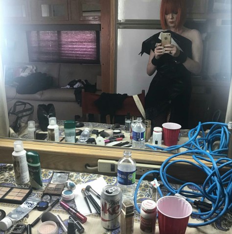 I love dressing room portraits so much, especially when their protagonists are people I admire. This is certainly the case of Shirley Manson, frontwoman of Garbage. She took this selfie before performing at the Kaaboo Festival in San Diego last Semptember. Let’s see what’s on the table (from left to right).
