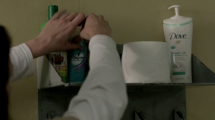 Aloprecil Apretol cinnamon and rosemary rinse cream, Degree deodorant in Fresh Oxygen, Dove Cream Oil body cream in Black Cindy’s bunk shelf.