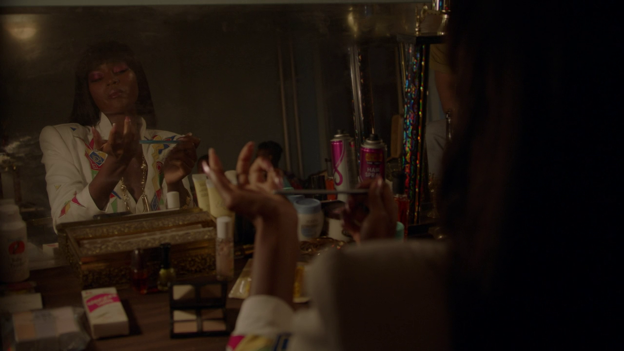 Angel (Indya Moore) finally scores a modeling job for the Wet ‘n Wild spring 1990 campaign. While she’s having her make-up done on set, we can see L’Oreal Elnett Satin strong-hold hairspray in front of her.