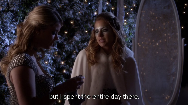 [1] A similar scene happened in S01E05 (Reality Bites Me): in that case, Jenna and Hanna were in the same elevator. Moreover, Mona pointing out that Jenna is wearing Jungle Red (which happens to be Alison’s favourite lipstick colour) could indicate she was the one who left the message on Spencer’s mirror in S01E04 (Can You Hear Me Now?).