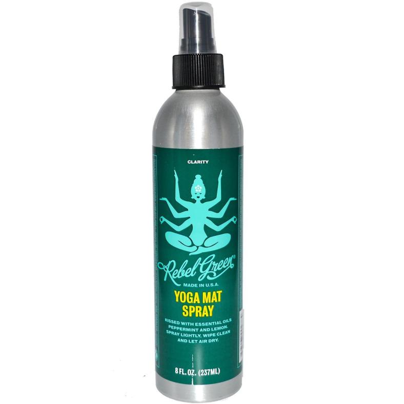 Rebel Green yoga mat spray in Clarity on Aria’s desk.