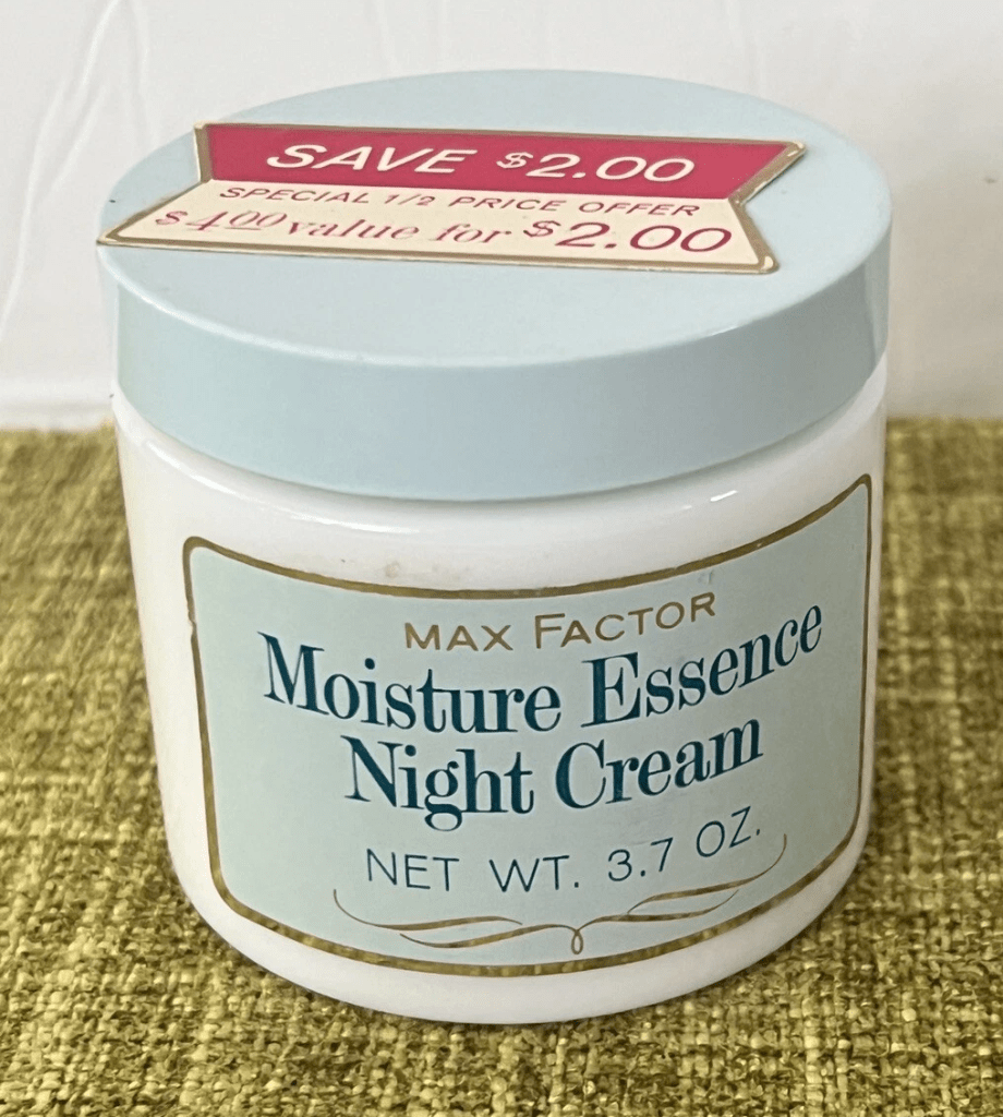 The jar sitting on the same counter is a Max Factor skincare product – Moisture Essence night cream.