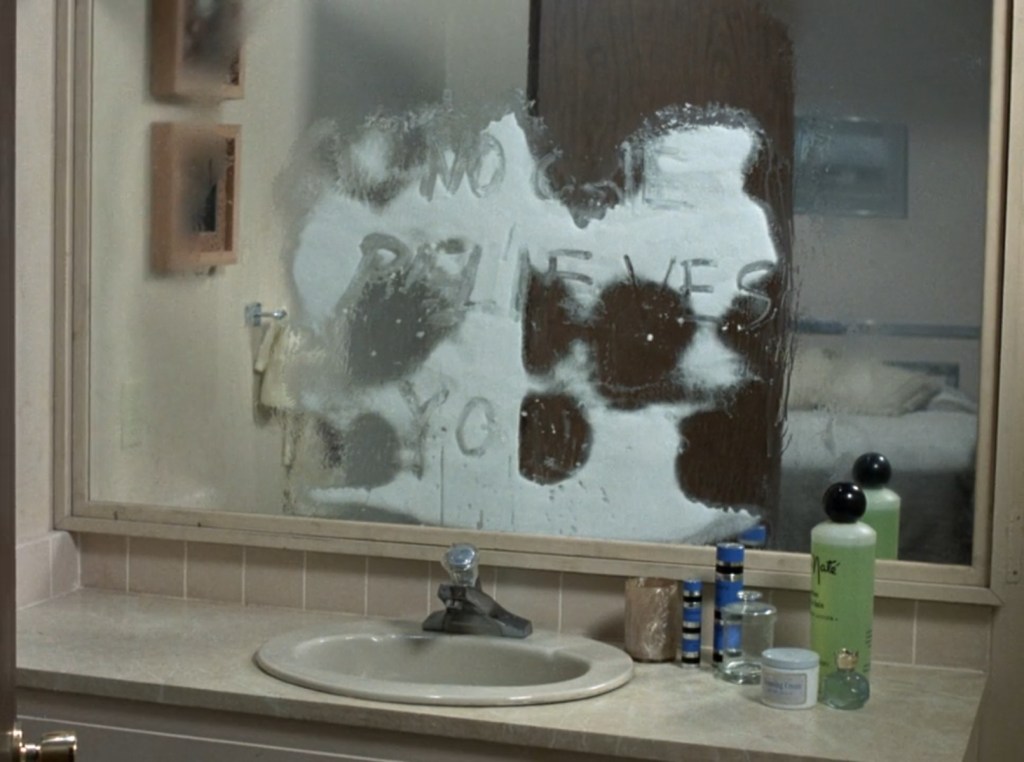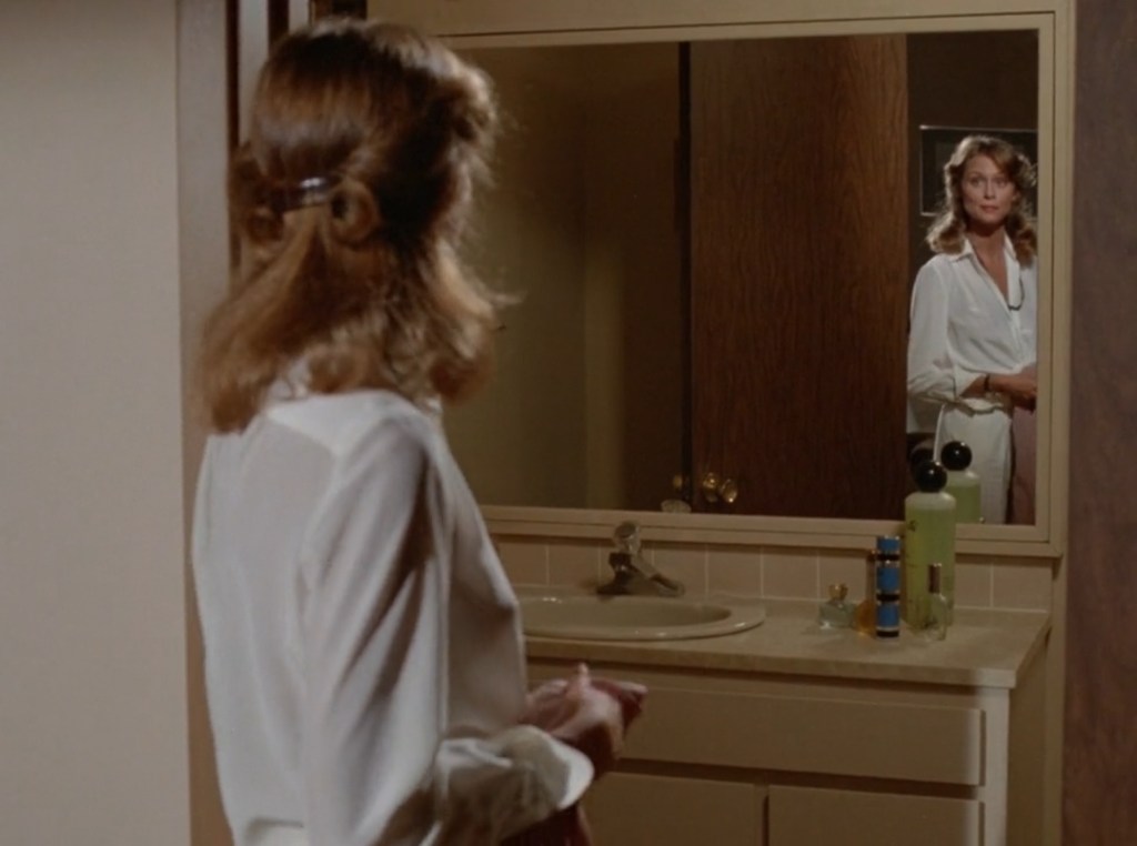 Later in the film, we can see a different selection of fragrances on the counter. The Lelong balloon bottle and Charlie are gone, but Jean Naté and Yves Saint Laurent Rive Gauche (two bottles of it!) are still there.