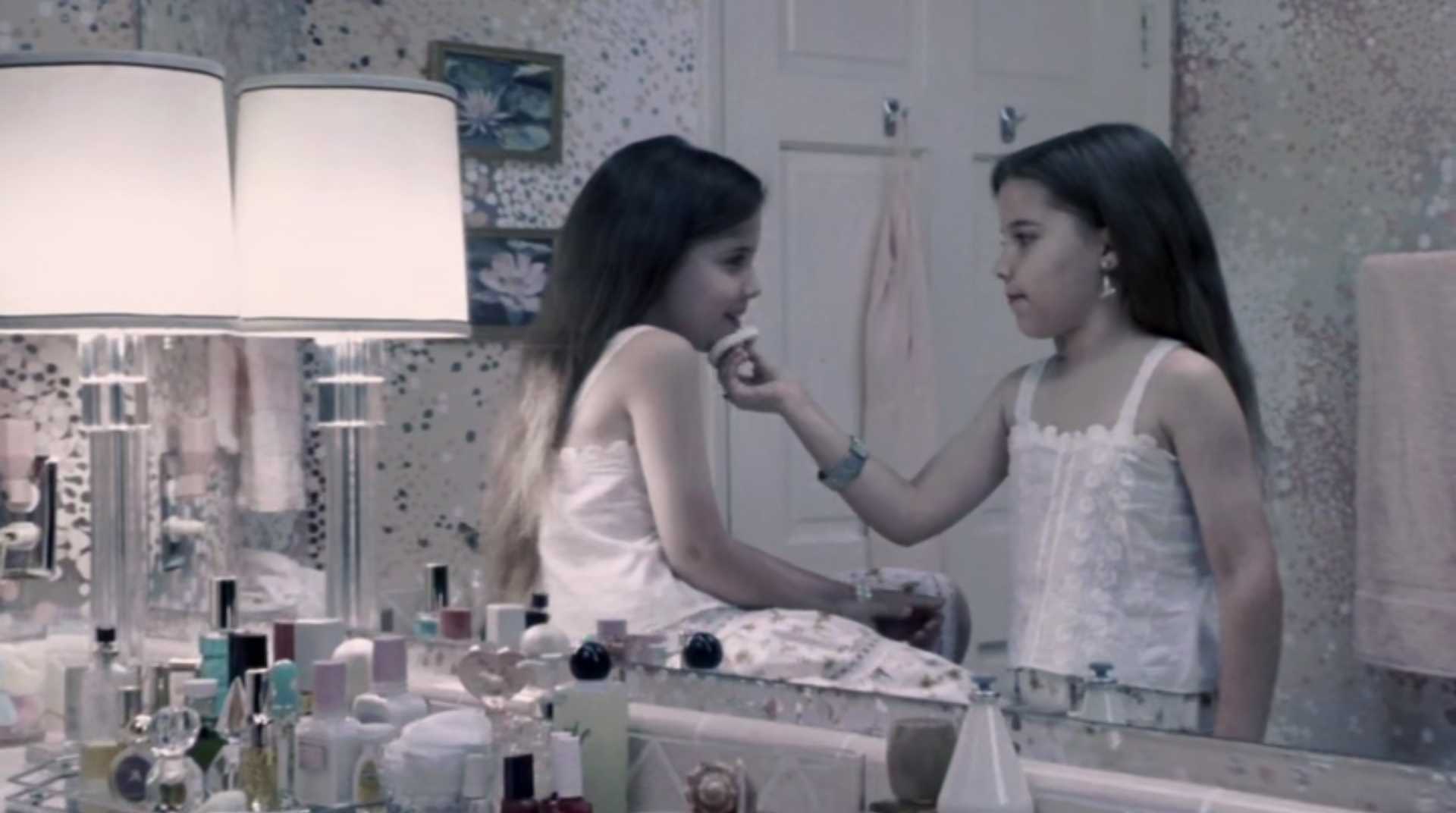 The opening credit sequence is set in a bathroom, where one girl is putting make-up on her twin. Later in the film, we will see these are Hedy (one of the protagonists, whose real name is actually Ellen Besch) and her twin sister. Many bottles are on the tiled counter.