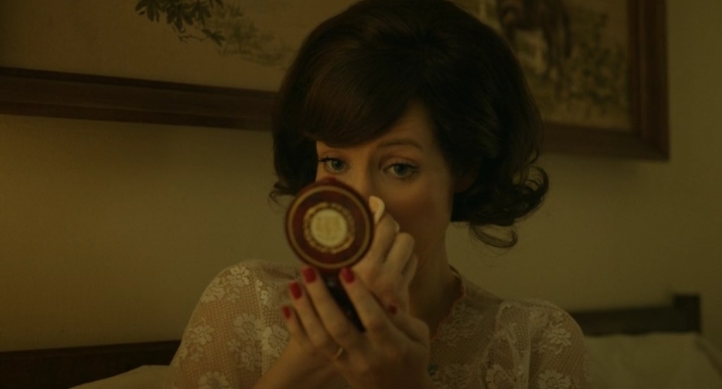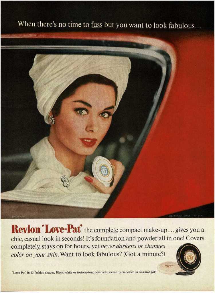 The compact Doris uses while putting on some black eye pencil is by Revlon again. It’s made of black plastic with square edges; originally used for the Love Pat pressed powder, it’s now used for the Touch and Glow moisturizing powder. Judging from the three gold lines on the eye pencil, I think it’s another Revlon product.