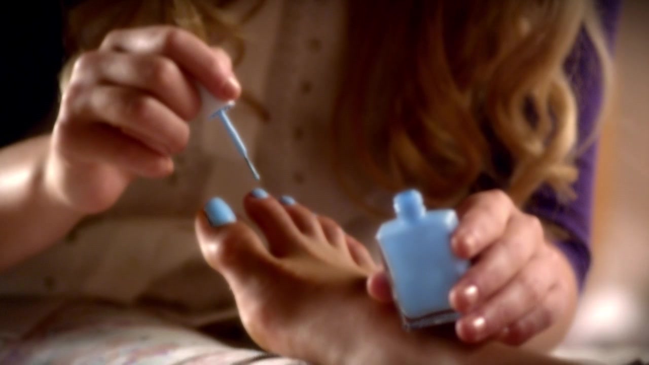 Obsessive Compulsive Cosmetics nail polish. I think the shade used by Ali on Emily’s toe nails could be Something (pastel bridal blue).