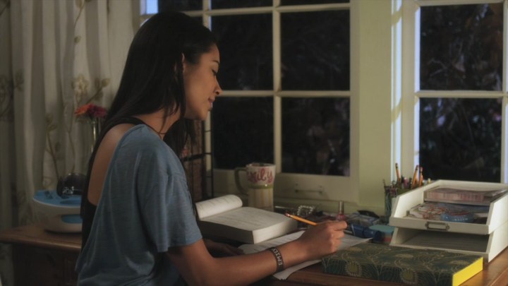 There are some skincare products in Peach Salinger’s bathroom. The brownish bottle with gold accents is Clarins Double Serum, while the smaller blue bottle is Booster Repair, again by Clarins.