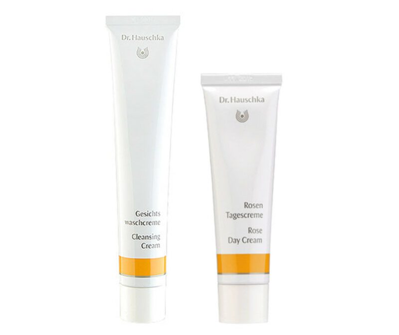 On the far left (top shelf) there’s a tube of Dr. Hauschka rose day cream.